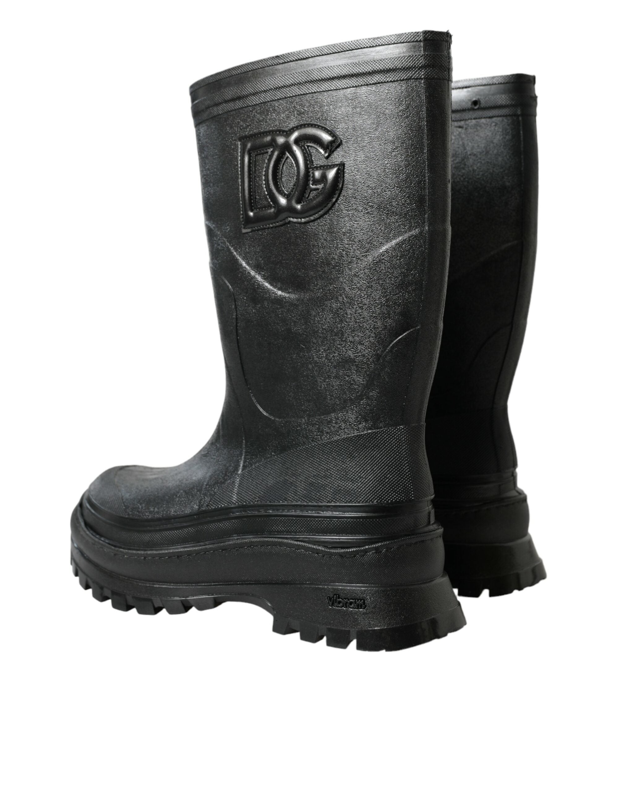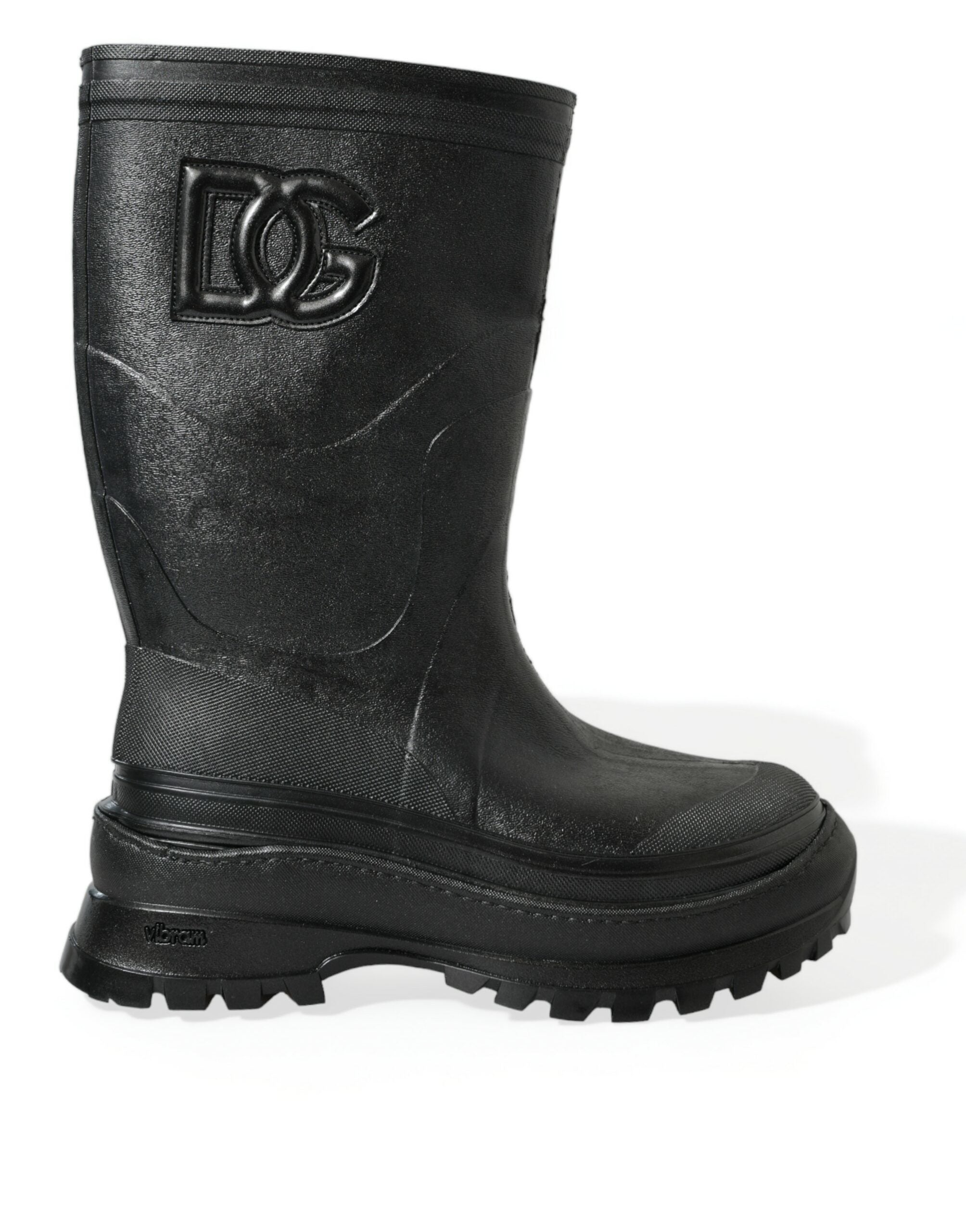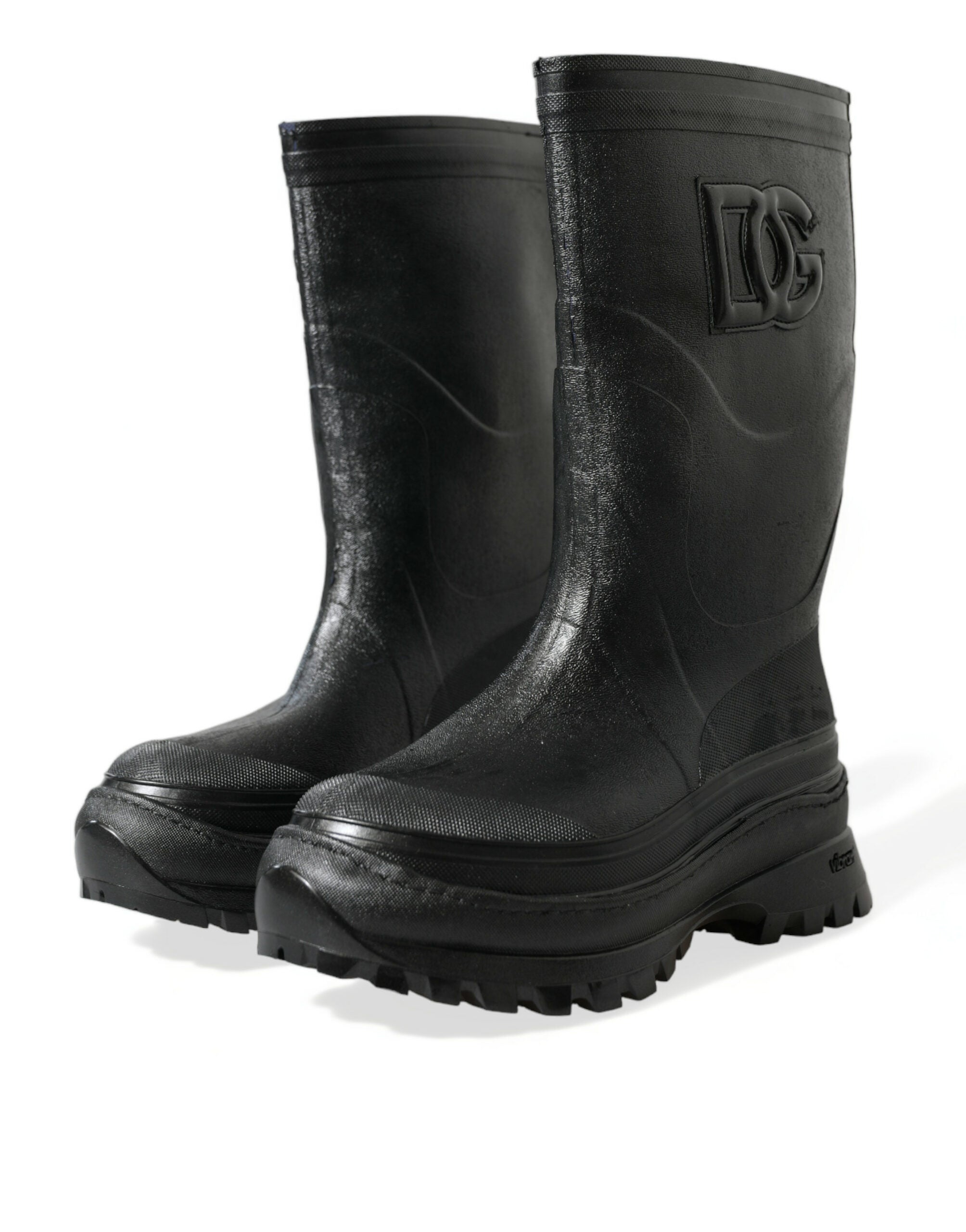 Stay stylish even on rainy days with these stunning, 100% Authentic Dolce & Gabbana metallic rubber rain boots. These mid-calf boots feature a sleek black color, accented with a crossover DG logo for that touch of luxury. Constructed with a durable TPU/leather upper and a robust rubber sole, they ensure both comfort and durability. Perfect for splashing through puddles or simply making a fashion statement. Made in Italy, these boots showcase exquisite craftsmanship and iconic style.