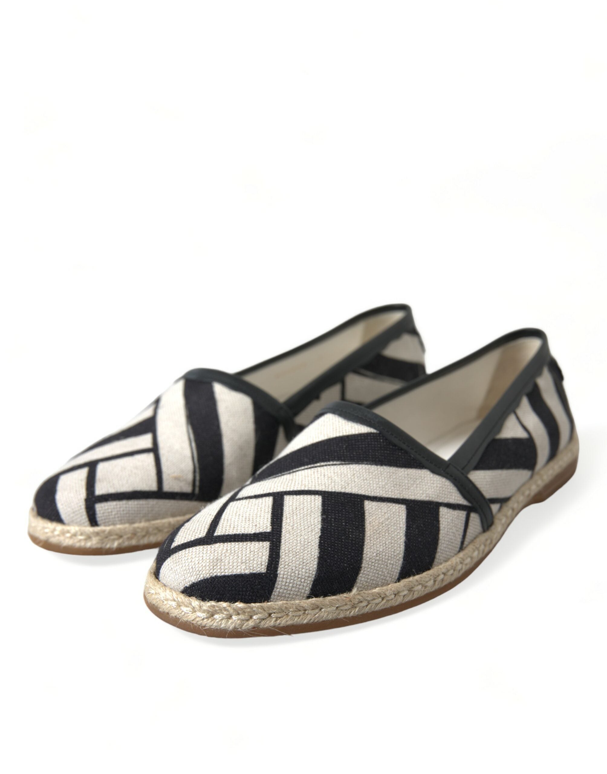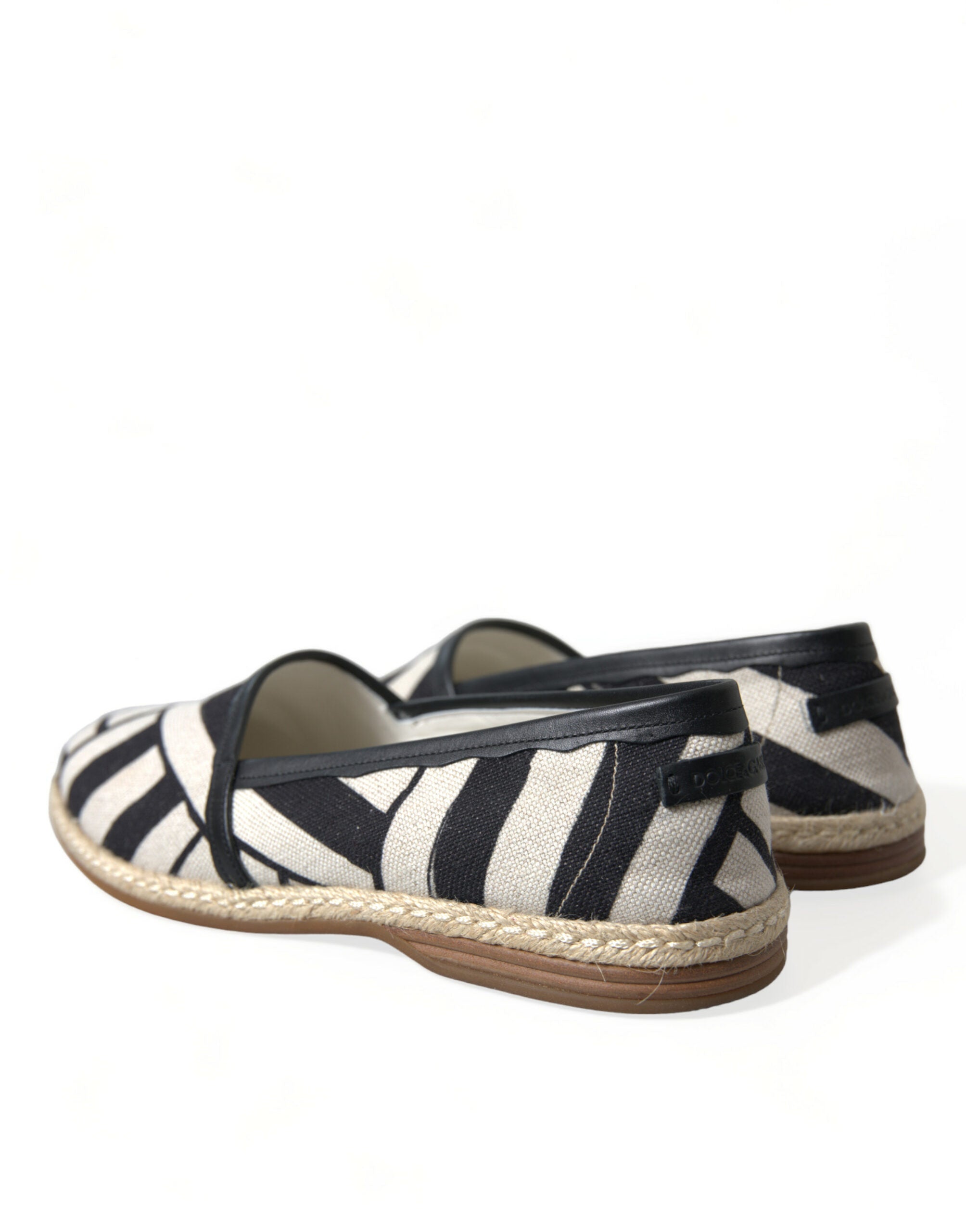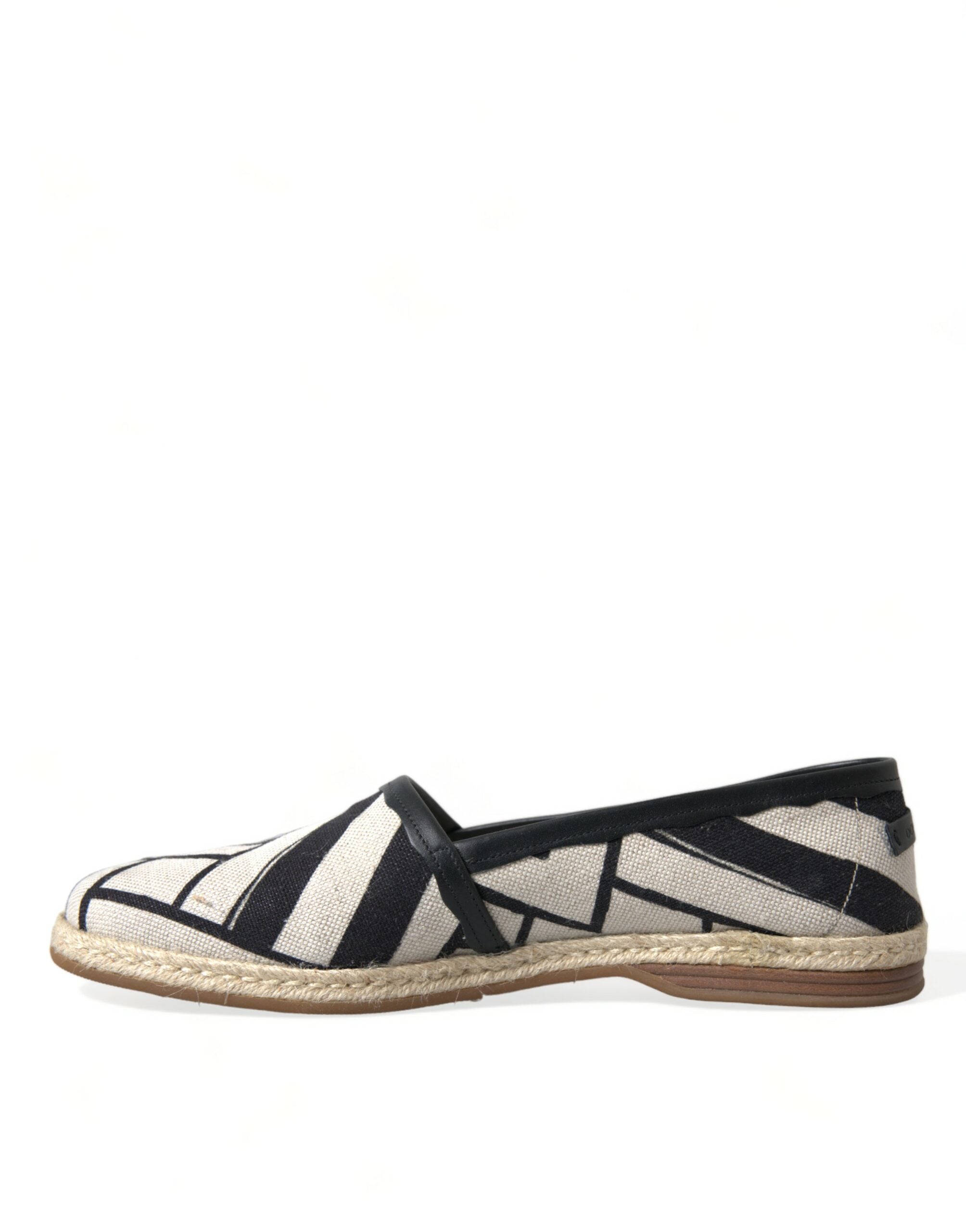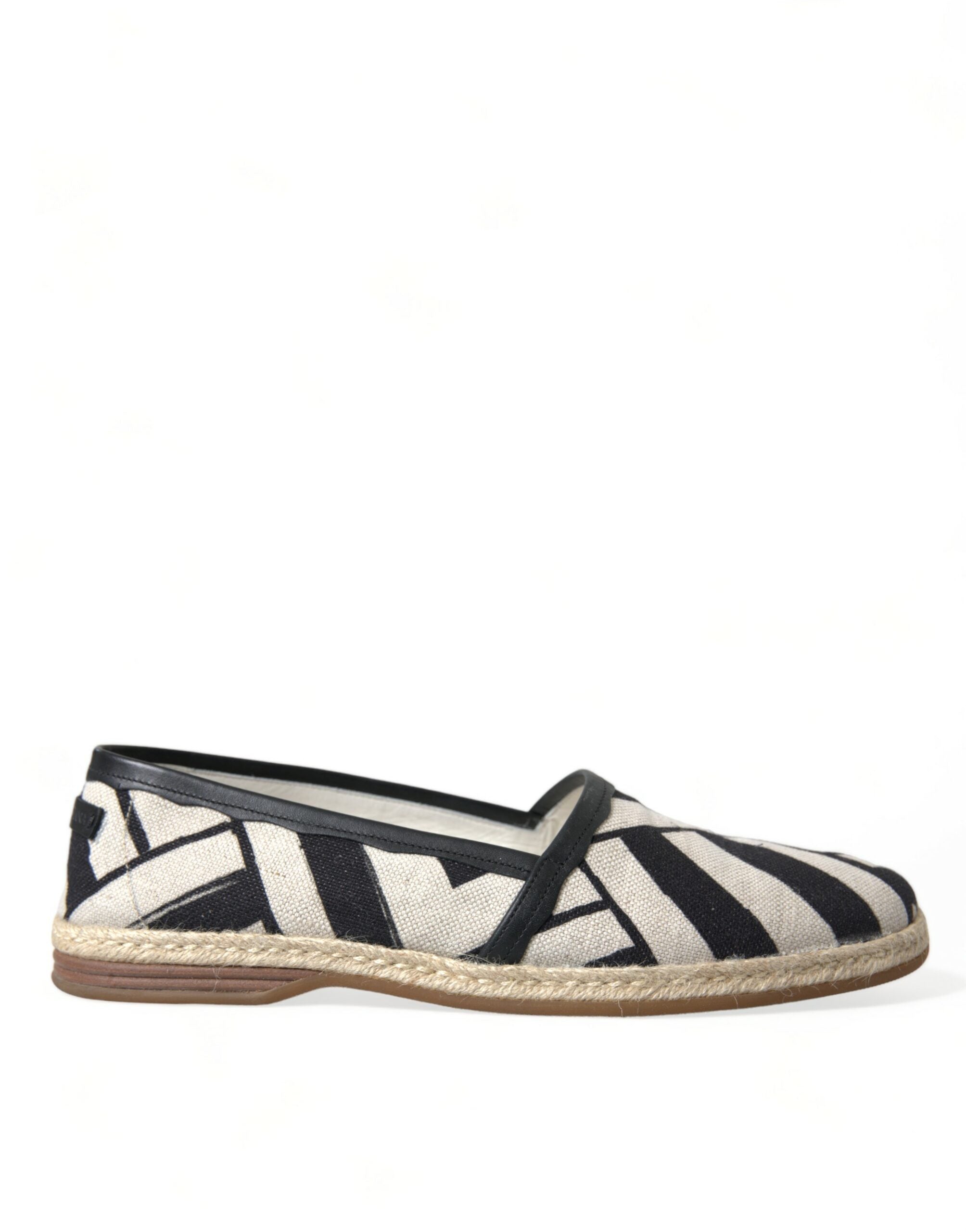 Step into luxury with these chic Dolce & Gabbana espadrilles, perfect for adding a touch of elegance to your casual ensemble. These black and white striped shoes, crafted from a blend of cotton, linen, and leather, exude Italian craftsmanship and stylish comfort. The supple leather lining and insole, along with the durable rubber sole, ensure both luxury and longevity. While preowned, this pair comes with tags, demonstrating minimal wear that only highlights the incredible deal on offer.