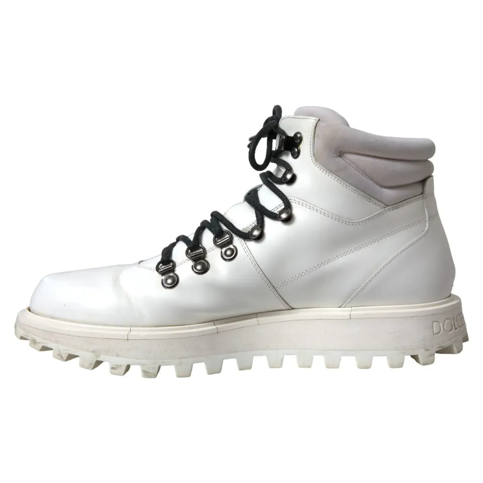 Gorgeous preowned with tags, 100% Authentic Dolce & Gabbana white Vulcano trekking boots and crafted from leather and feature a round toe, a ridged rubber sole, a lace-up front fastening, an ankle length and side and rear logo detailing.
