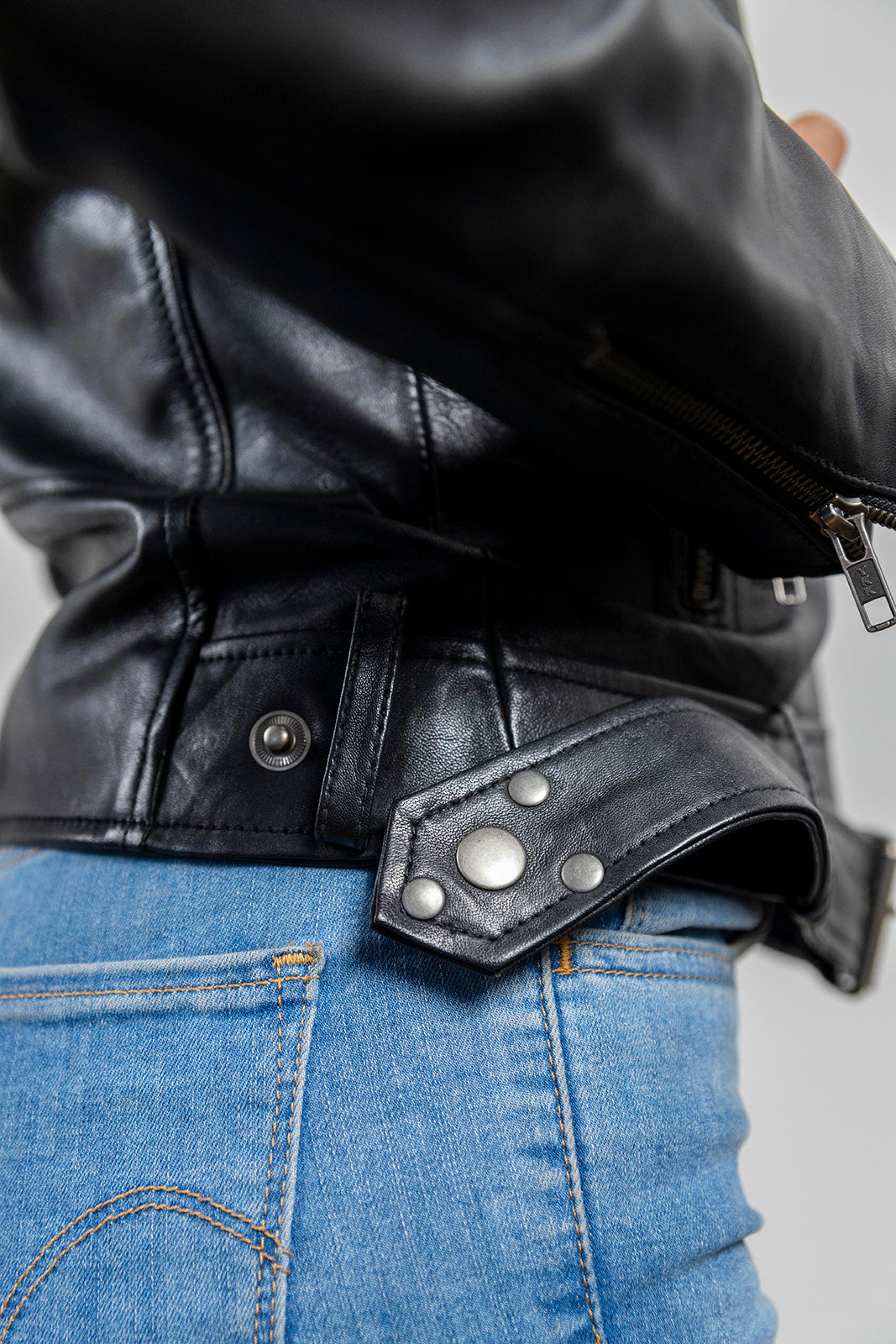 Add an edgy look to your outerwear with this women's Whet Blu motorcycle leather jacket. Also available in Navy Blue, Violet, and Red Fire.